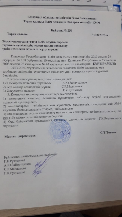 31 август 2023 0 1 2 3 4 5 Жекеленген санаттағы білім алушылар мен тәрбиеленушілердің құжаттарын қабылдау үшін комиссия мүшесін құру туралы