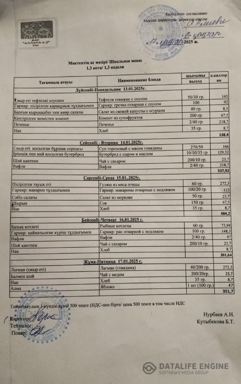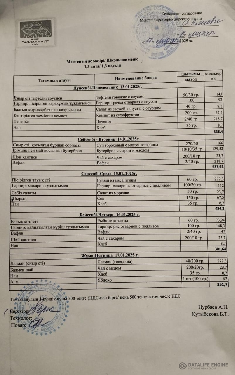 Апталық ас мәзірі » Коммунальное государственное учреждение "Средняя школа №4" отдела образования города Тараз Жамбылской области