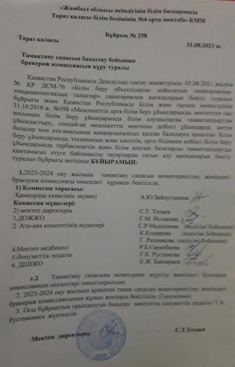 Тамақтану сапасын бақылау бойынша бракераж комиссиясын құру туралы » Коммунальное государственное учреждение "Средняя школа №4" отдела образования города Тараз Жамбылской области