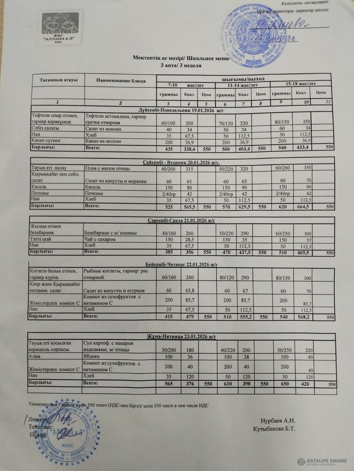 Апталық ас мәзірі 19.01.-23.01.2026