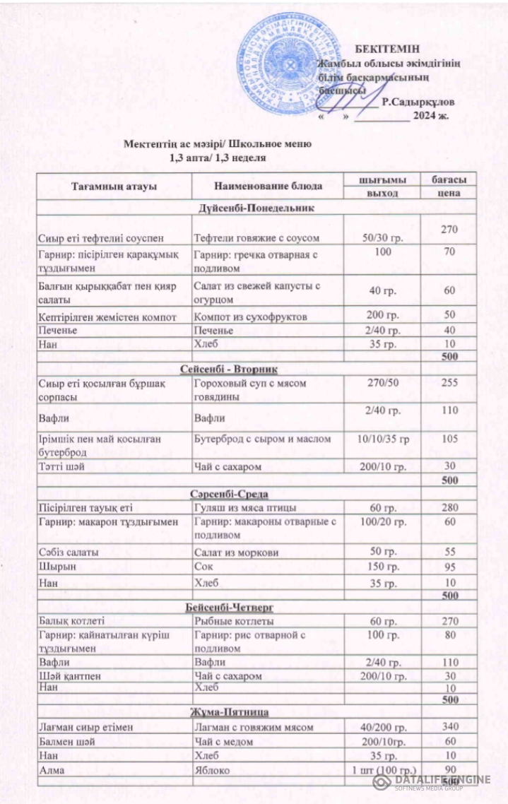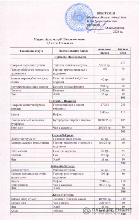 Ас мәзірі апталық » Коммунальное государственное учреждение "Средняя школа №4" отдела образования города Тараз Жамбылской области